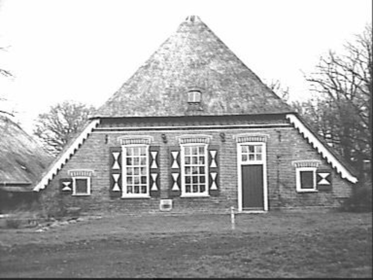 Boerderij onder fors rieten schilddak; onderschoer. De vensters van het woongedeelte zijn met luiken behangen