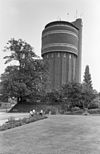 WATERTOREN met UITZICHTRUIMTE op ronde plattegrond, aan de oostzijde voorzien van twee uitgebouwde, hoogoplopende ronde traptorens die elk een hoogte van 37,85 meter bereiken. De zuidelijke traptoren was bedoeld als publieksingang voor de uitzichtruimte, de noordelijke toren was gereserveerd voor het dienstpersoneel. De watertoren telt een souterrain plus vijf bouwlagen en wordt gedekt door een half kegelvormig dak op de voormalige uitzichtruimte, waarvan het oorspronkelijke ruberoïd is vervangen door zink.