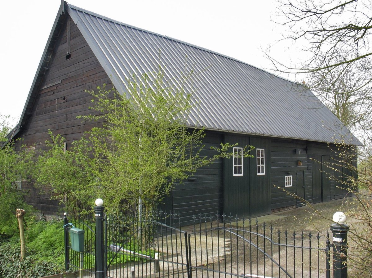 De gerabatte dwarsdeelschuur onder zadeldak is aan de erfzijde gedekt met riet, aan de veldzijde met zwarte oud-Hollandse pannen, evenals de aanbouw onder lessenaardak. De schuur is gebouwd op een lage bakstenen sokkel. De houten delen aan het erf zijn groen, die aan de straat zwart. Deze dwarsgevel wordt beƫindigd met een makelaar en eenzijdige windveer langs het dakdeel met pannen. In de gevel bevinden zich verder een inloopdeur aan ijzeren gehengen, een zesruiter, een ongedeeld en een halfrond raam. Aan het erf ligt tussen hoge inrijschuifdeuren met staande zesruiters en de inloopdeur een horizontale zesruiter. Verder twee paar tweedelige opgeklampte deuren aan ijzeren gehengen. In de dwarsgevel achter liggen twee negenruits vensters, een inloopdeur en een zolderluik. De aanbouw onder lessenaardak is opgetrokken in kruisverband machinale baksteen. Hierin liggen drie recht afgesloten vensters met meerroedenverdeling en een deur. Aan de dakvoet een zinken goot op beugels.