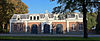 Stalgebouw met drie grote poorten, middenpartij door klok bekroond