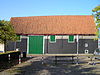 Houten zwartgeteerde schuur met pannen gedekt, naast de wolwelle